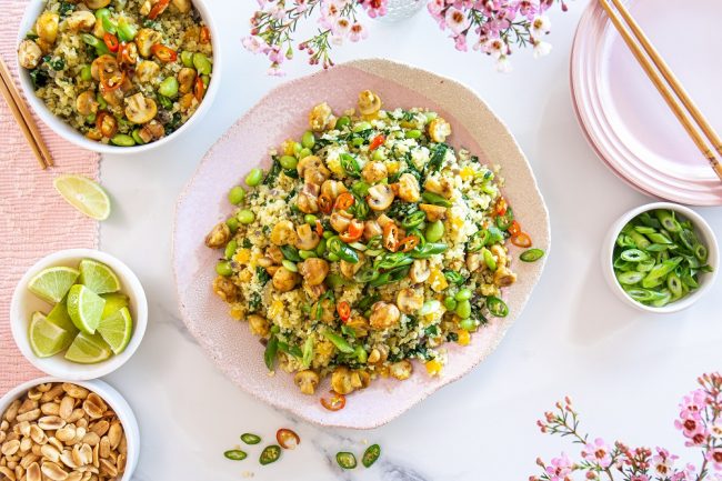 Dish cauli rice into bowls and squeeze over some fresh lime juice.